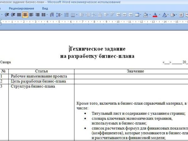 Структура Технического задания на разработку бизнес-плана
