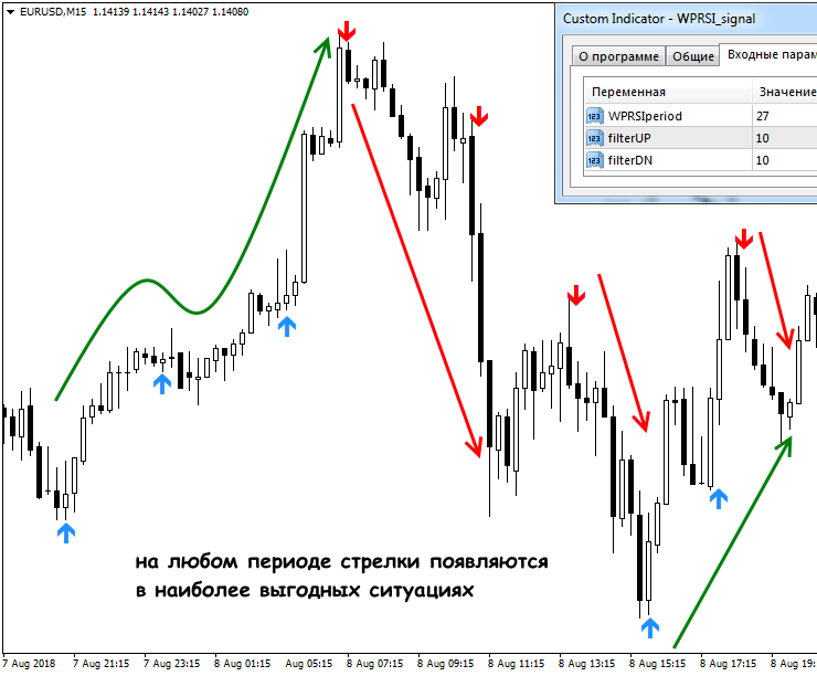 Универсальный стрелочный индикатор , подходящий для всех распространенных торговых систем. Таймфрейм стоит устанавливать на 5-15 минут, на долговременные торги работа индикатора не заточена, но при этом учитывает глобальную статистику повышения либо понижения курса валютной пары.